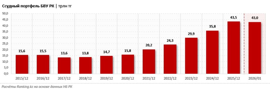 По итогам 2025 года ссудный портфель казахстанских банков второго уровня достиг рекордных 43,5 трлн тенге, увеличившись на 21,3%. За пять лет показатель вырос почти втрое, сообщает Ranking.kz.