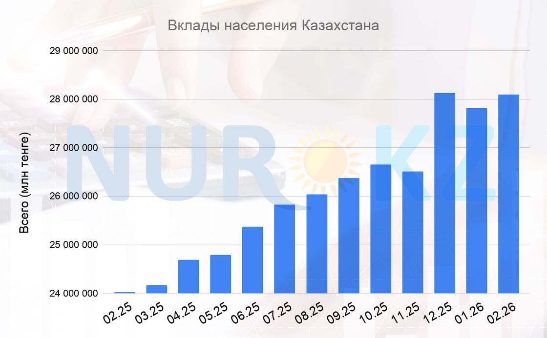 Согласно данным Национального банка РК, к марту общий объем вкладов населения почти достиг 28,1 трлн тенге. За месяц прирост составил 0,99%.