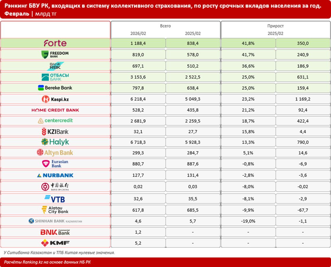 Лидером по росту срочных вкладов населения среди всех БВУ РК стал ForteBank: прирост составил 41,8% за год, или 350 млрд тг. К концу февраля объем срочных депозитов в банке достиг почти 1,2 трлн тг.