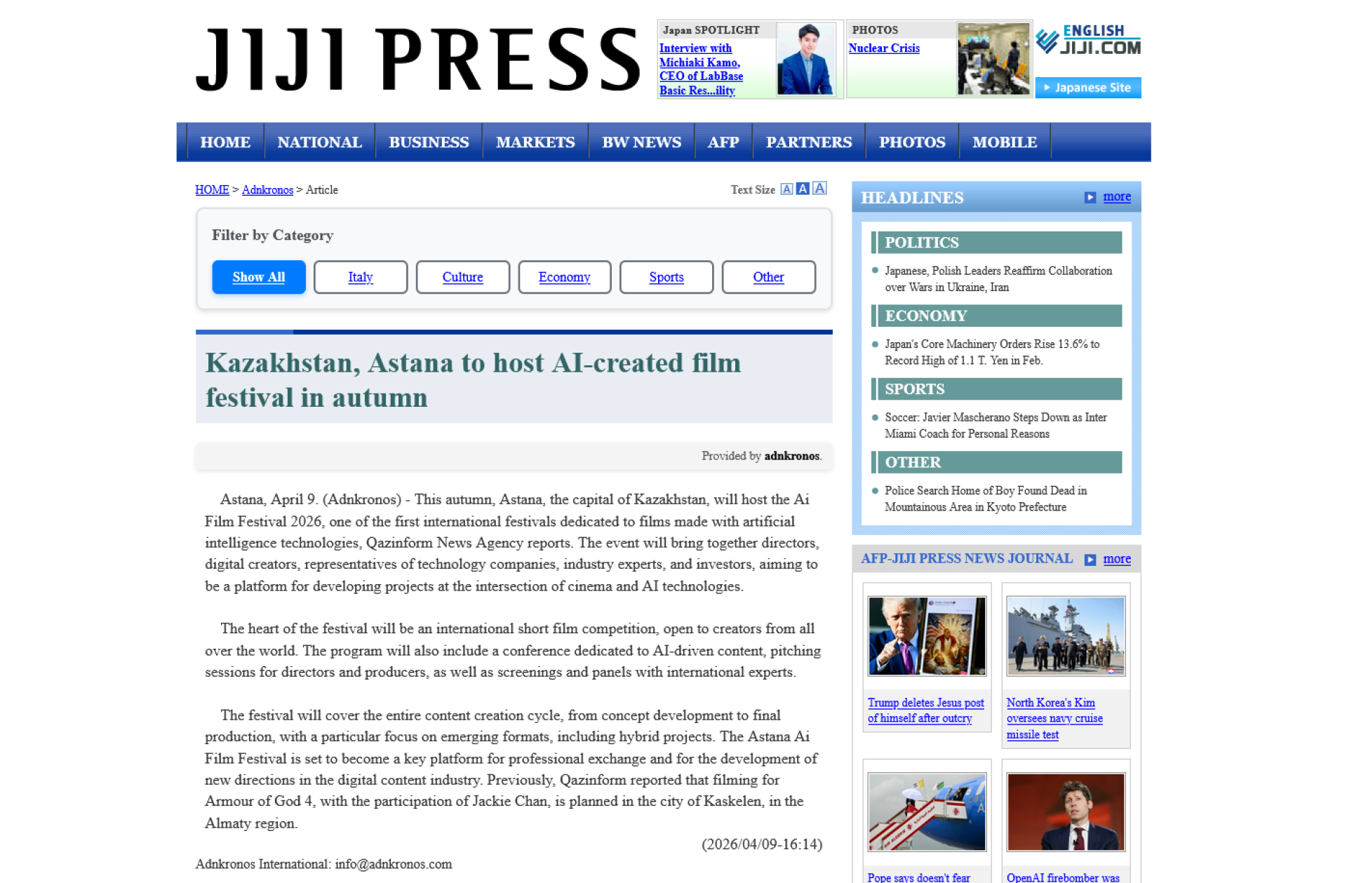 Сразу после анонса казахстанского фестиваля генеративного кино Astana AI Film Festival публикации о нем начали появляться в международных медиа, включая крупные новостные порталы и специализированные издания о технологиях и кино.