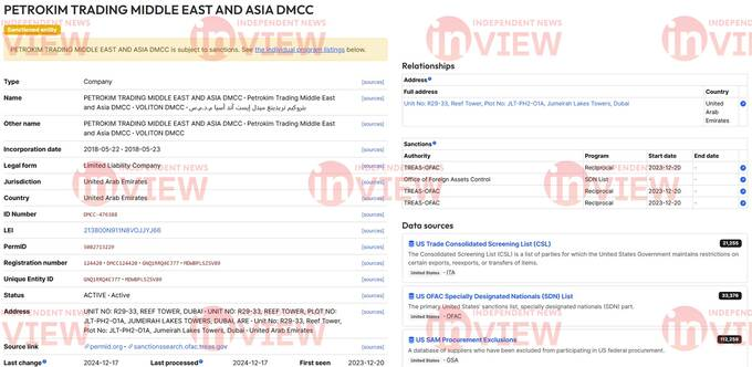 В этой же свободной экономической зоне зарегистрирована компания Petrokim trading Middle East and Asia DMCC, ранее носившая название Voliton DMCC. О ней журналисты Reuters также упоминали в своем материале. Фирма попала под санкции США в декабре 2023 года.