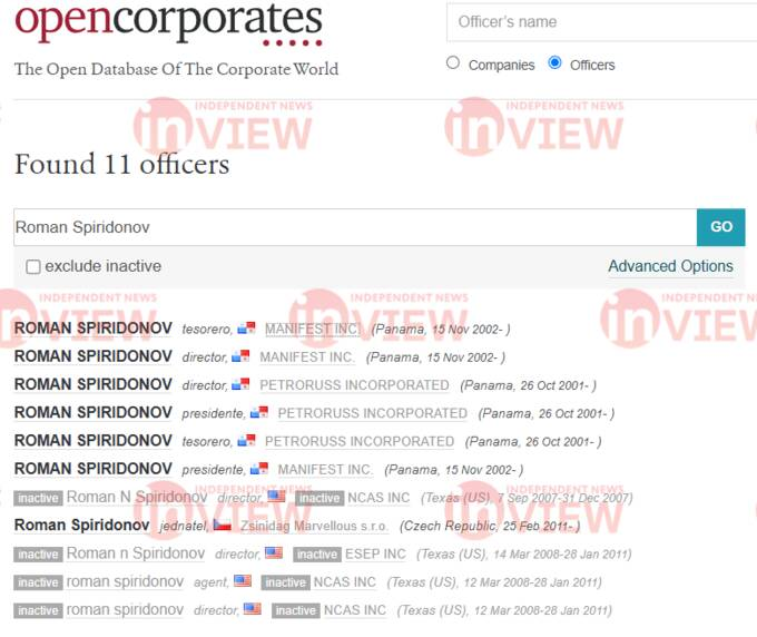 Она упоминается в документах Panama Papers. Роман Спиридонов указан как держатель акций в этой компании по крайней мере с 2010 года.