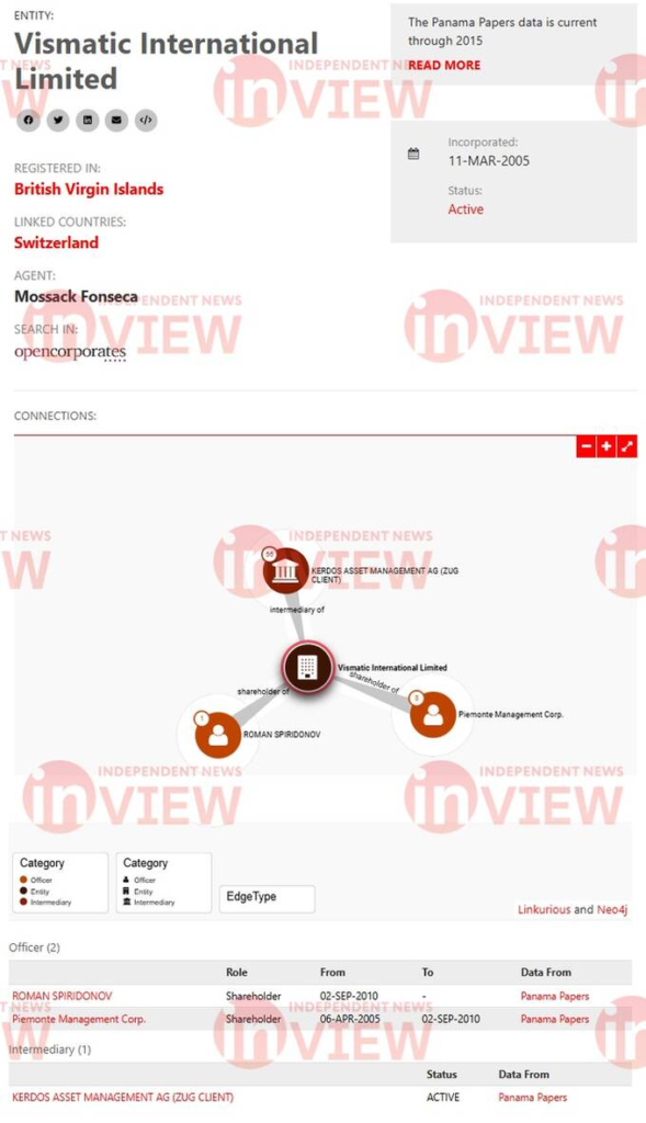 В то же время директором обеих панамских компаний указана компания с регистрацией на Британских Виргинских островах – Vismatic international limited.