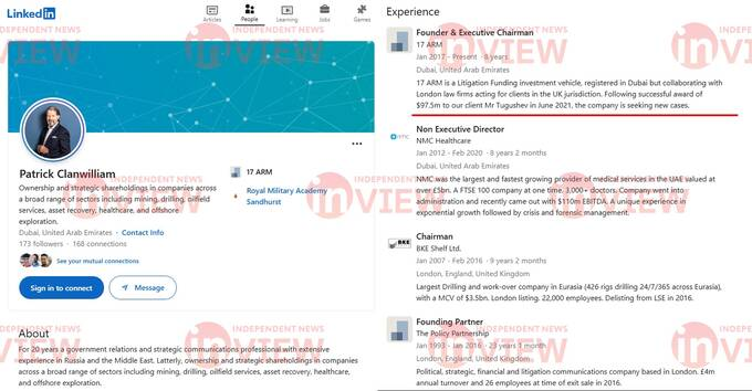 Основатель 17 Arm Патрик Кленвильям (Patrick Clanwilliam) на своей странице в LinkedIN сделал очень интересную пометку: «17 ARM – это инвестиционная компания, зарегистрированная в Дубае, но сотрудничающая с лондонскими юридическими компаниями, действующими для клиентов в юрисдикции Великобритании. После успешного присуждения 97,5 миллиона долларов нашему клиенту господину Тугушеву в июне 2021 года компания ищет новые дела».